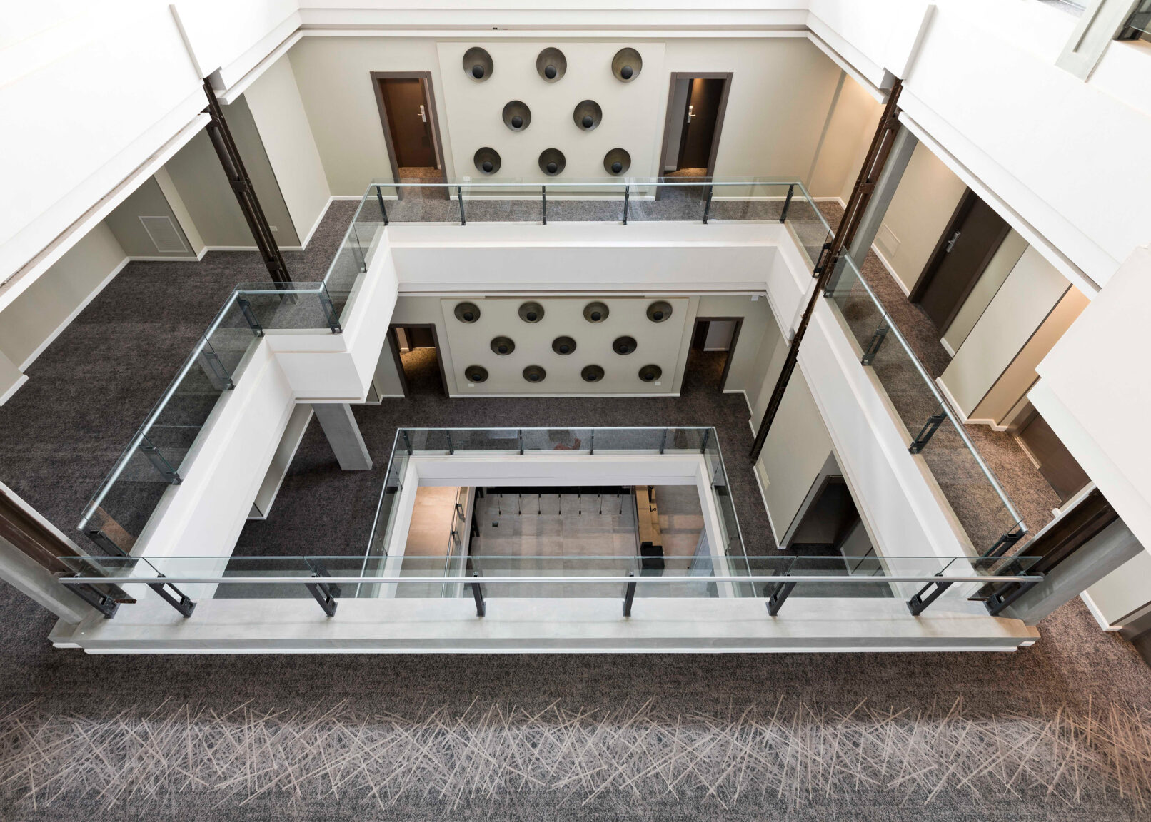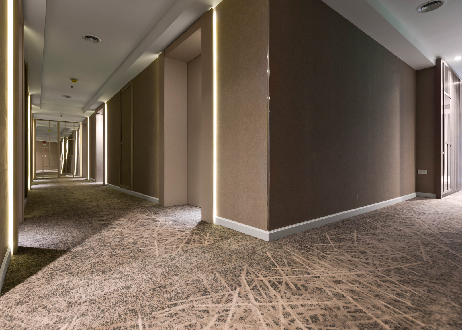 La cadena de hoteles Villa Huinid, originaria de Bariloche, abrió su nueva sede en Buenos Aires en el barrio de Balvanera. Para su primer desembarco en la ciudad, construyó una moderna torre de ocho pisos adosada a la fachada de un edificio antiguo. En colaboración con el estudio de la arquitecta Viviana Melamed, se diseñaron alfombras Magna en tonos grises con rayas irregulares para los pasillos, y un segundo diseño que combina beige con líneas color crudo y celeste para el salón de eventos.