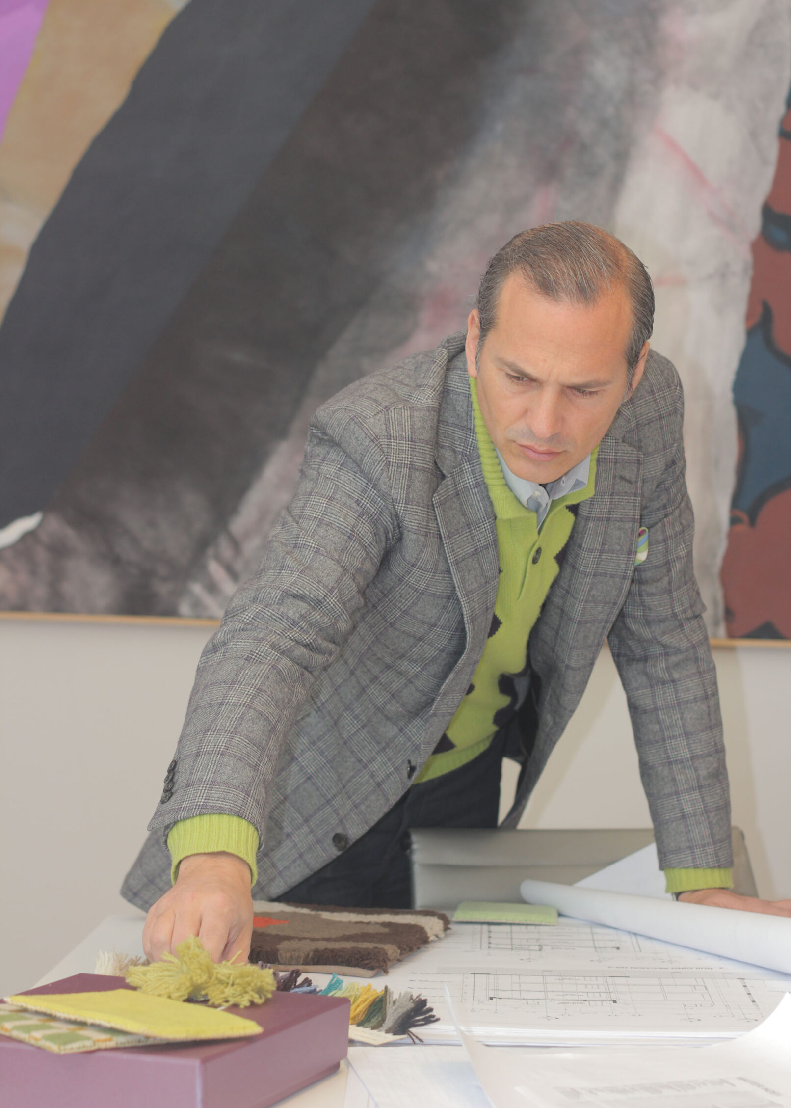 “Mi alfombra es un homenaje a David Hicks, uno de los máximos representantes del interiorismo del siglo XX, que se destacó por sus diseños textiles con composiciones geométricas y colores brillantes y que más tarde se dedicó al paisajismo. Mi diseño remite a un jardín francés tomando esa geometría moderna y esas paletas de verdes, grises, azules y naranjas tan características de Hicks.” — Javier Iturrioz.